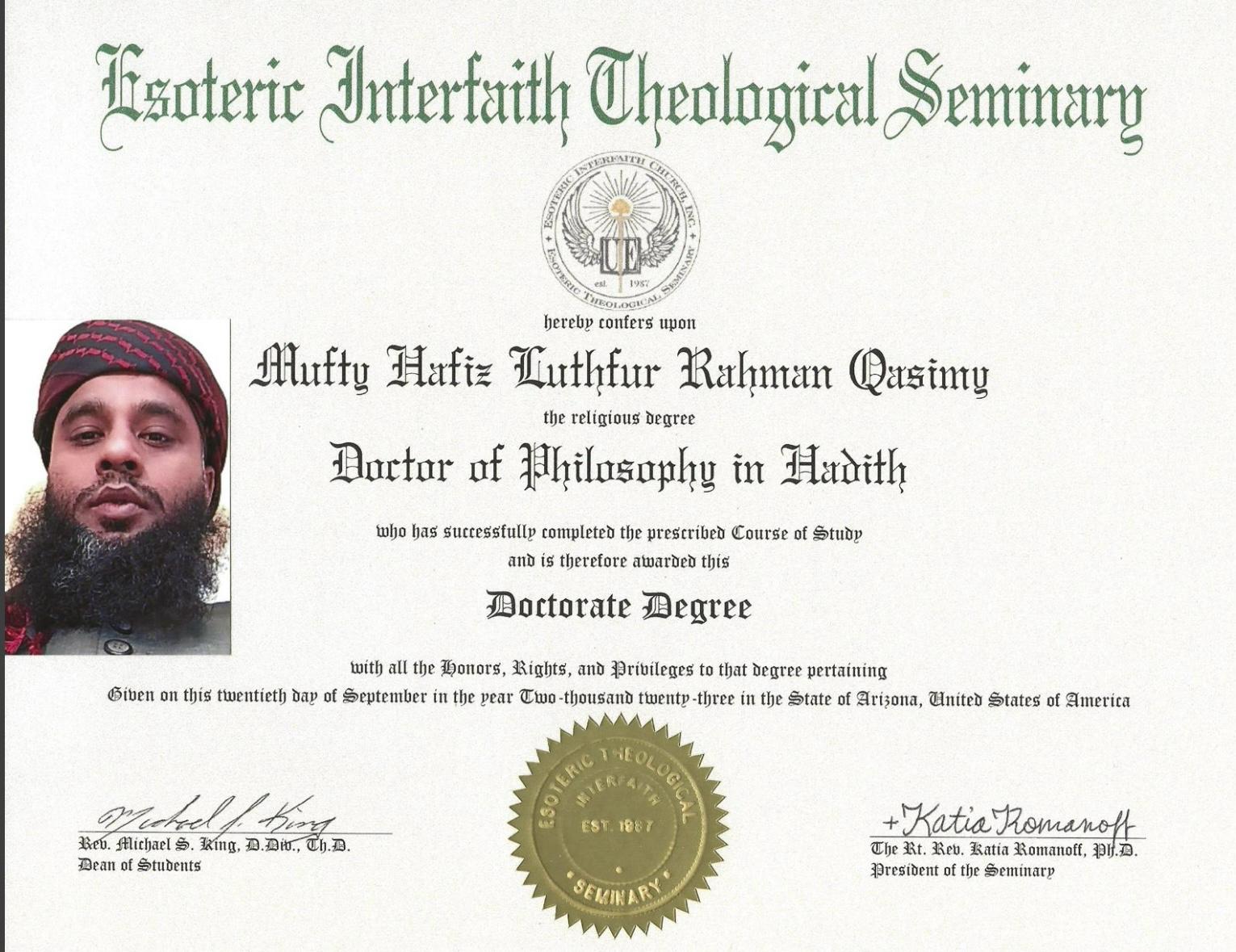 উল্লেখ্য, মুফতী ক্বাসিমীর পিএইচডি পাওয়া সংস্থা ইনিস্টিটিউশন ইন্টারফেইথ থিওলজিকাল সেমিনারি গত ২৫ বছর যাবত আমেরিকার ৫০টি স্টেটসহ যুক্তরাজ্য ও কানাডায় বিভিন্ন রিলিজিয়াস ডিপ্লোমা ও পিএইচডি ডিগ্রী ফেডারেল সরকারের আওতায় লিগ্যালভাবে দিয়ে আসছে।